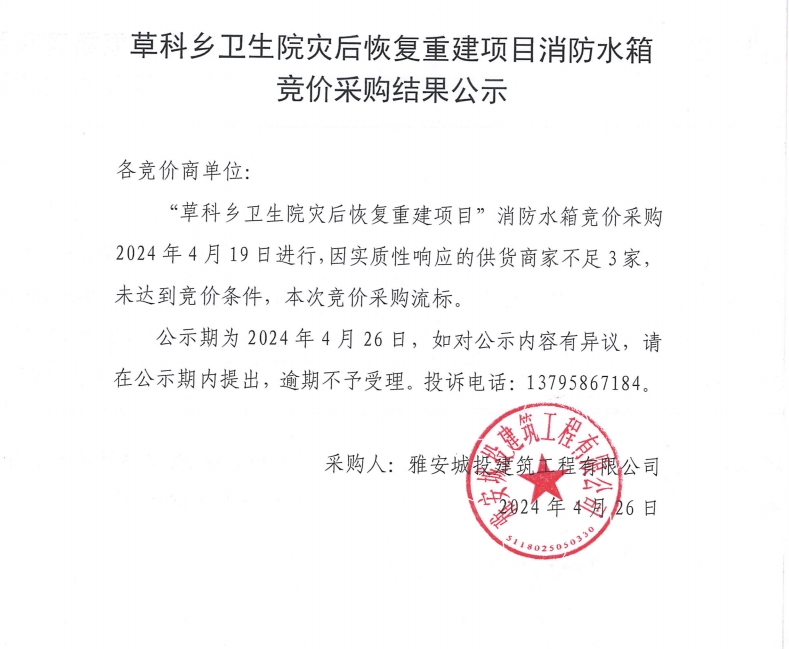 草科鄉(xiāng)衛(wèi)生院災后恢復重建項目消防水箱競價采購結果公示