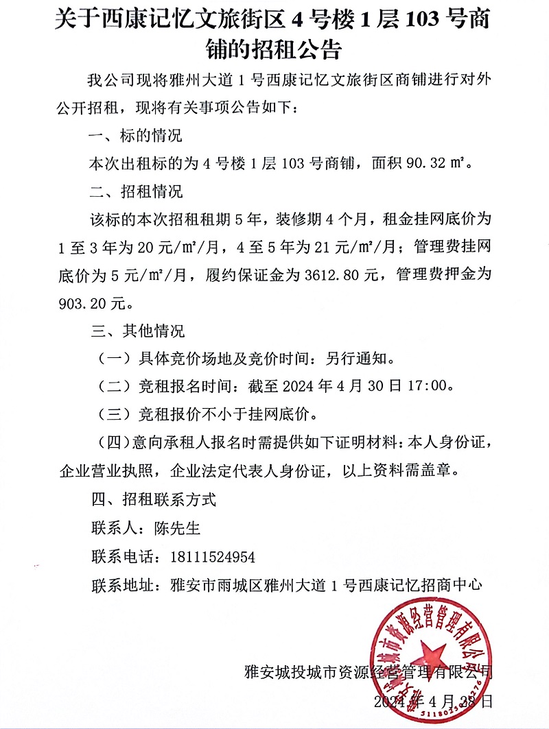 關(guān)于西康記憶文旅街區(qū)4號(hào)樓1層103號(hào)商鋪的招租公告