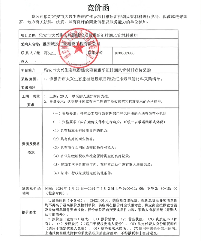 雅安市大興生態(tài)旅游建設項目雅樂匯排煙風管材料采購競價公告