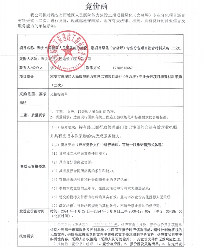 附件:競(jìng)價(jià)函-雅安市雨城區(qū)人民醫(yī)院能力建設(shè)二期項(xiàng)目綠化(含總坪)專業(yè)分包項(xiàng)目瀝青材料采購(gòu)(二次)