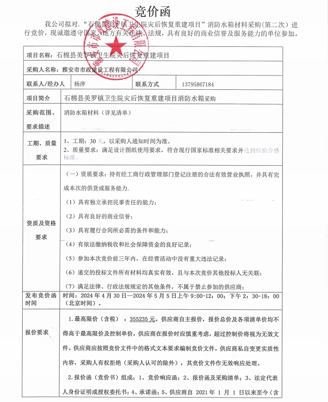 石棉縣美羅鎮(zhèn)衛(wèi)生院災(zāi)后恢復(fù)重建項(xiàng)目消防水箱采購(gòu)(第二次)競(jìng)價(jià)公告