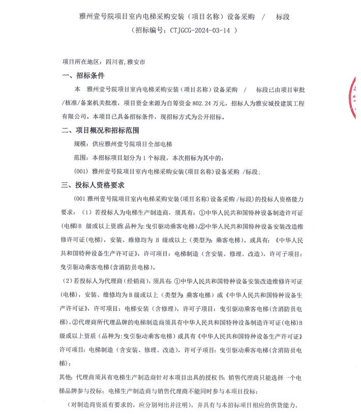 雅州壹號(hào)院項(xiàng)目室內(nèi)電梯采購(gòu)安裝(項(xiàng)目名稱)設(shè)備采購(gòu)/標(biāo)段公告