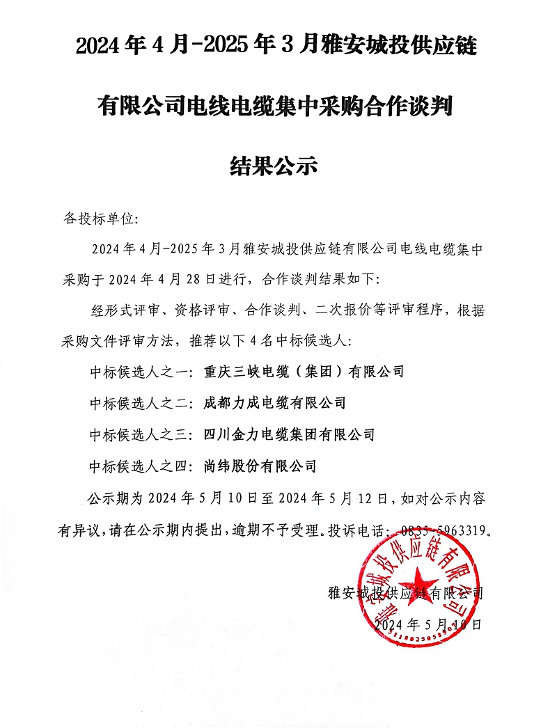 2024年4月-2025年3月雅安城投供應鏈有限公司電線電纜集中采購合作談判結果公示