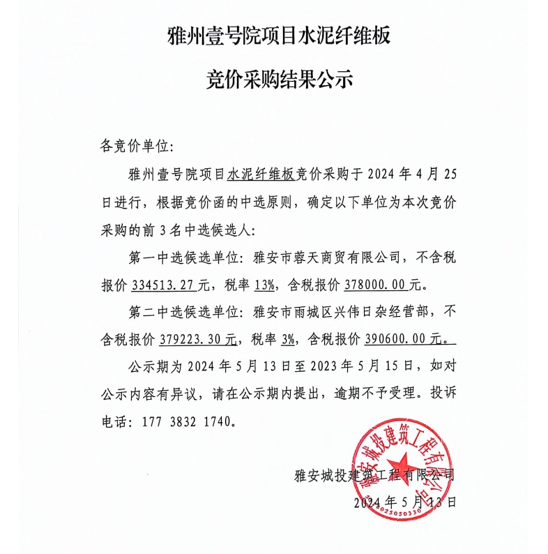 雅州壹號院項目水泥纖維板競價采購結果公示