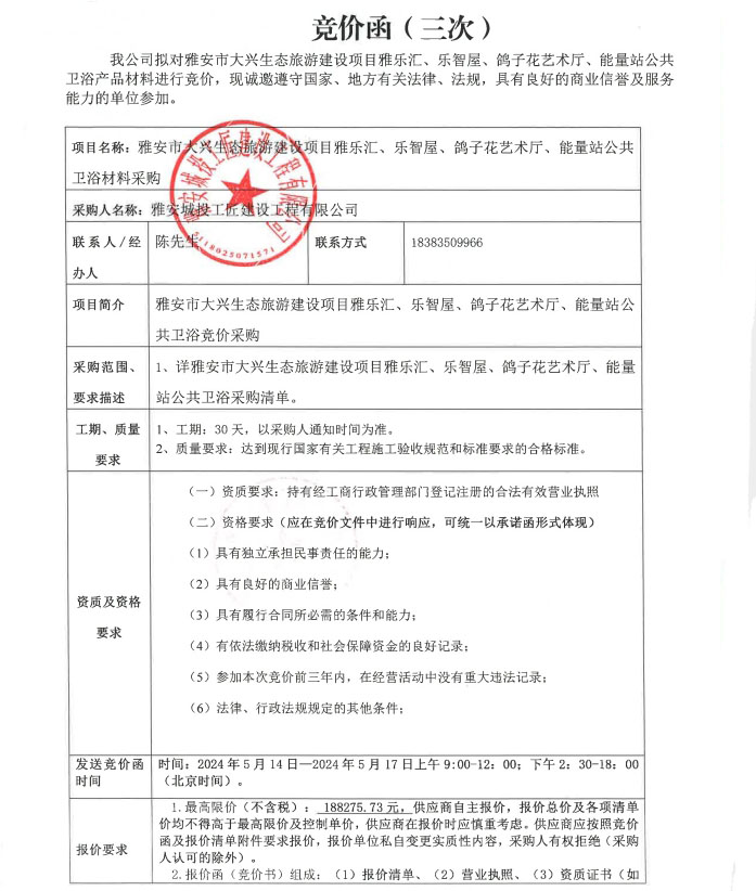 雅安市大興生態(tài)旅游建設(shè)項目雅樂匯、樂智屋、鴿子花藝術(shù)廳、能量站公共衛(wèi)浴材料采購(三次)競價公告