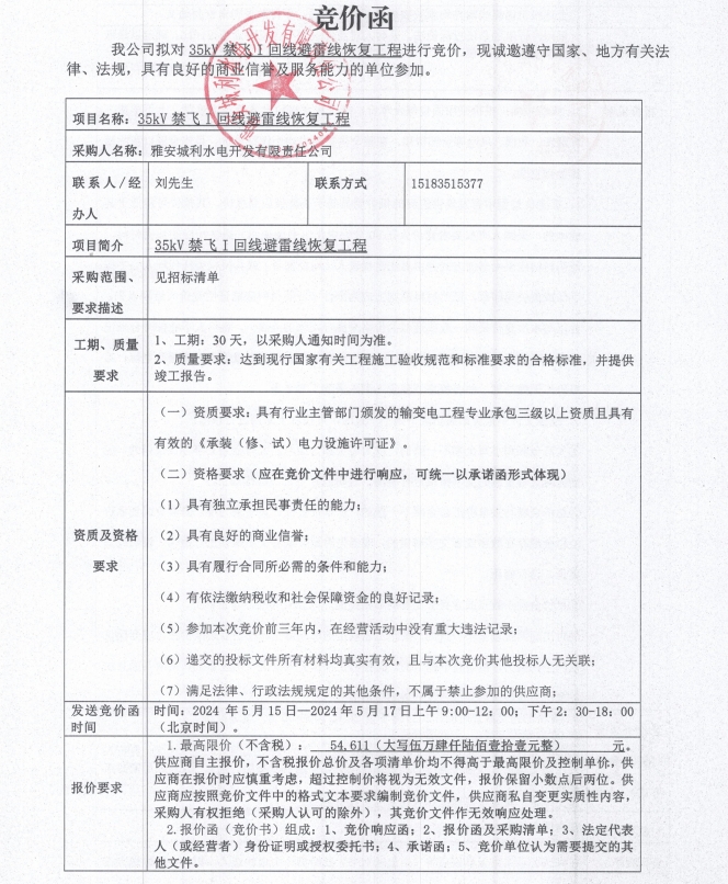 35kV禁飛I回線避雷線恢復(fù)工程競價(jià)公告
