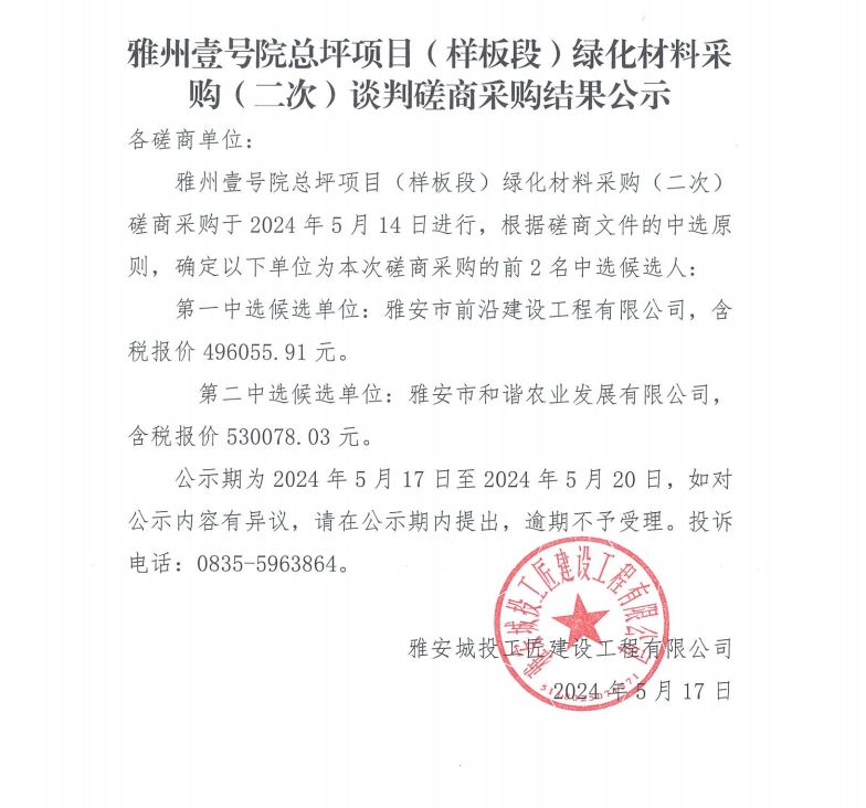 雅州壹號(hào)院總坪項(xiàng)目(樣板段)綠化材料采購(gòu) (二次)談判磋商采購(gòu)結(jié)果公示