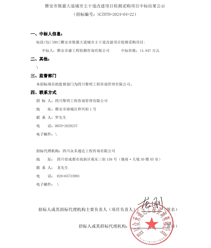 雅安市熊貓大道城市主干道改建項目檢測采購項目中標結(jié)果公示