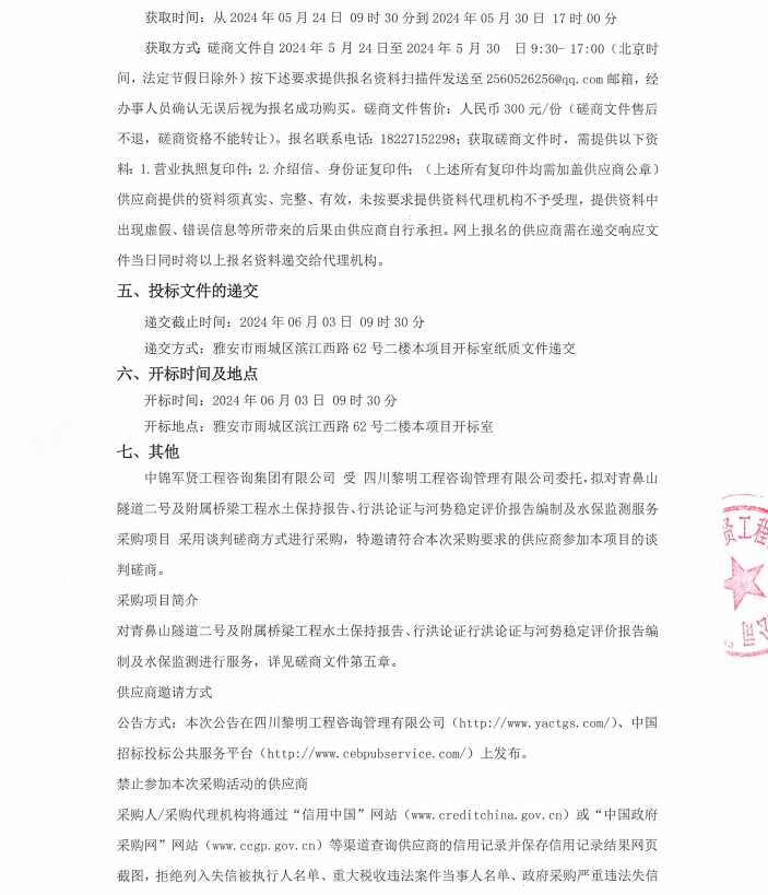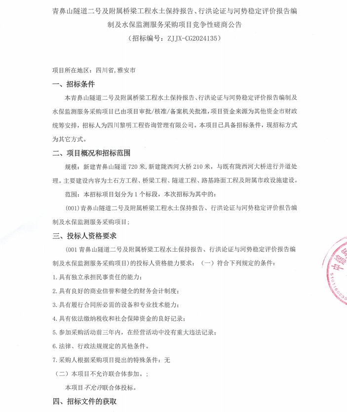 青鼻山隧道二號及附屬橋梁工程水土保持報(bào)告、行洪論證與河勢穩(wěn)定評價(jià)報(bào)告編制及水保監(jiān)測服務(wù)采購項(xiàng)目競爭性磋商公告