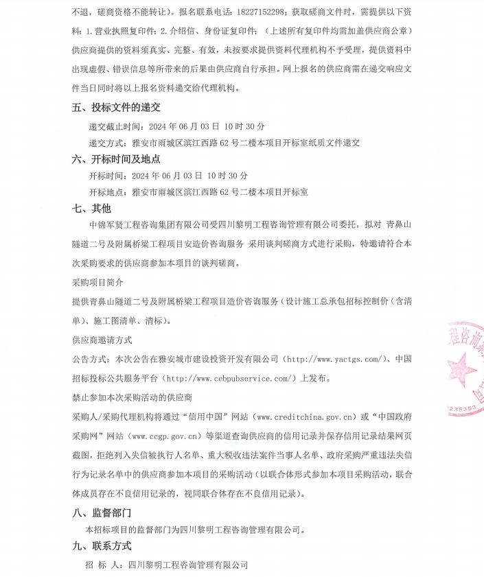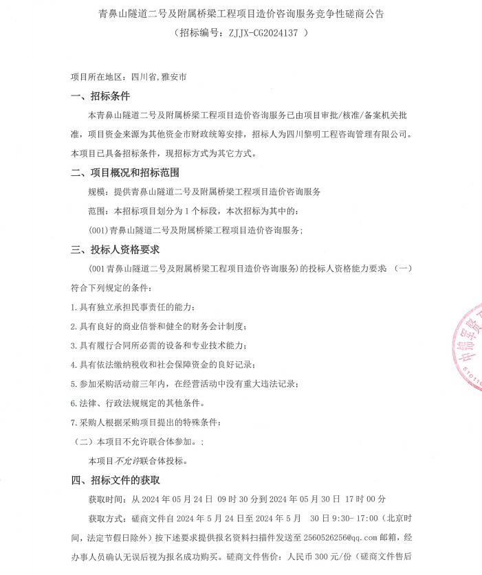 青鼻山隧道二號及附屬橋梁工程項(xiàng)目造價(jià)咨詢服務(wù)競爭性磋商公告