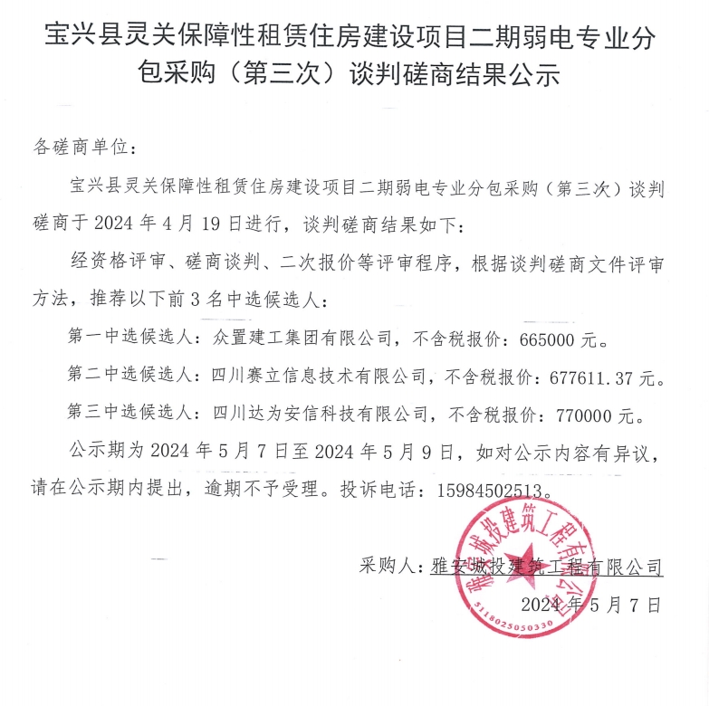 寶興縣靈關(guān)保障性租賃住房建設(shè)項(xiàng)目二期弱電專業(yè)分包采購(gòu)(第三次)談判磋商結(jié)果公示