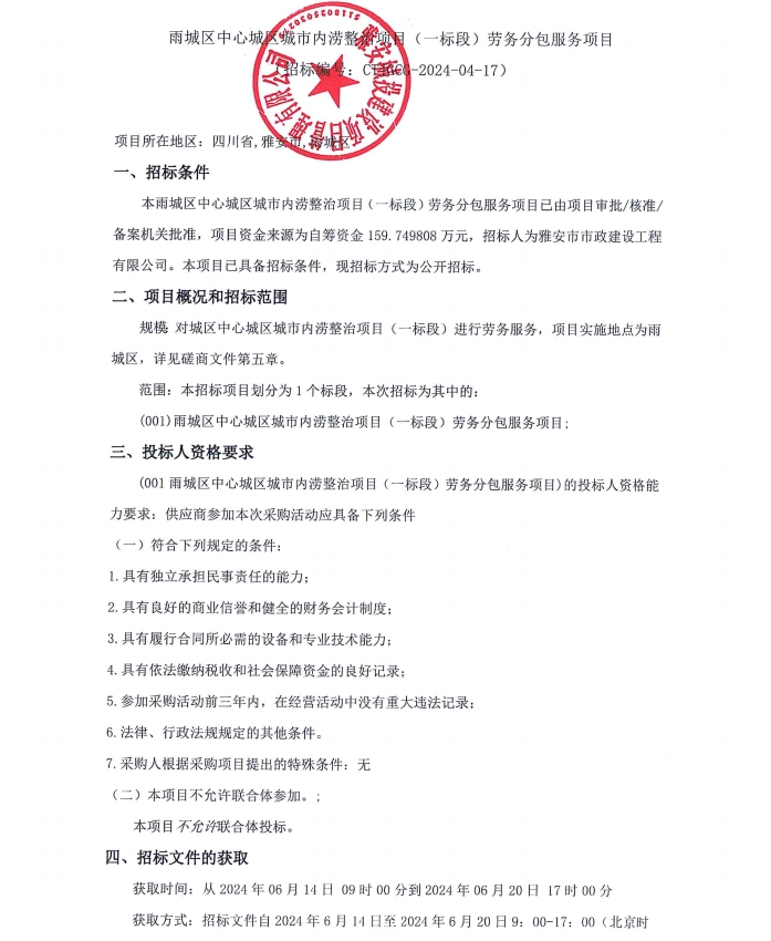 雨城區(qū)中心城區(qū)城市內(nèi)澇整治項(xiàng)目(一標(biāo)段)勞務(wù)分包服務(wù)項(xiàng)目公告
