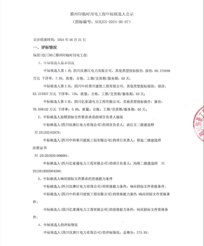 雅州印臨時用電工程中標(biāo)候選人公示