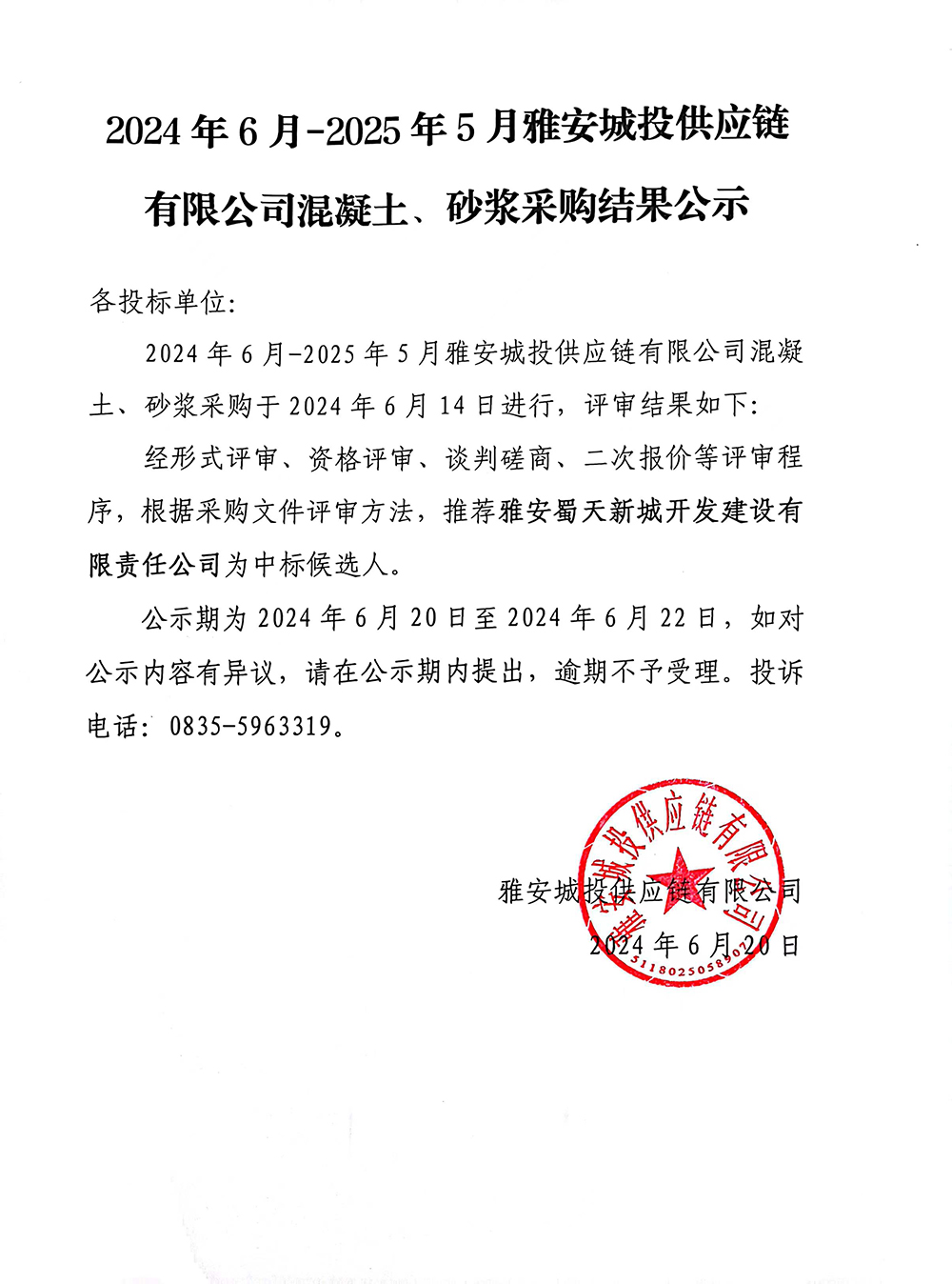 2024年6月-2025年5月雅安城投供應鏈有限公司混凝土、砂漿采購結果公示