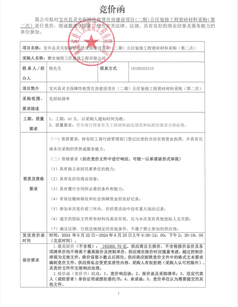 寶興縣靈關(guān)保障性租賃住房建設(shè)項(xiàng)目(二期)公區(qū)裝修工程瓷磚材料采購(gòu)(第二次)競(jìng)價(jià)公告