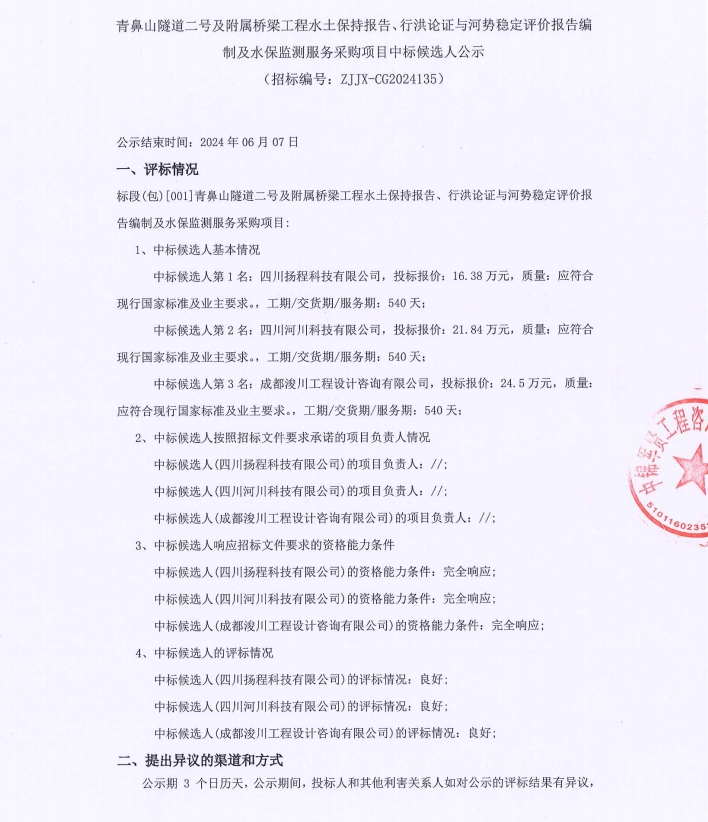 青鼻山隧道二號(hào)及附屬橋梁工程水土保持報(bào)告、行洪論證與河勢穩(wěn)定評(píng)價(jià)報(bào)告編制及水保監(jiān)測服務(wù)采購項(xiàng)目中標(biāo)候選人公示