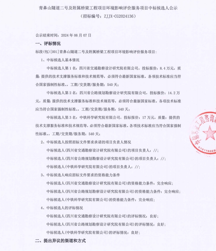 青鼻山隧道二號及附屬橋梁工程項目環(huán)境影響評價服務項目中標候選人公示