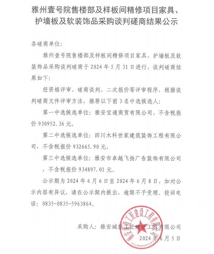雅州壹號院售樓部及樣板間精修項(xiàng)目家具、護(hù)墻板及軟裝飾品采購談判磋商結(jié)果公示