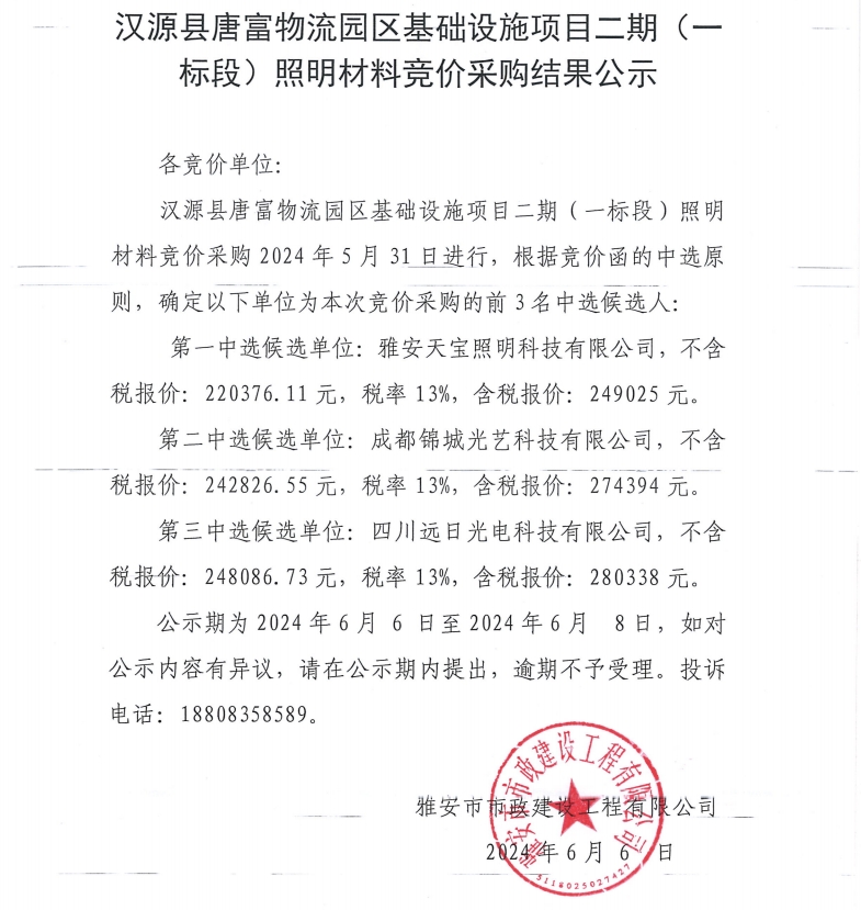 漢源縣唐富物流園區(qū)基礎設施項目二期(一標段)照明材料競價采購結(jié)果公示