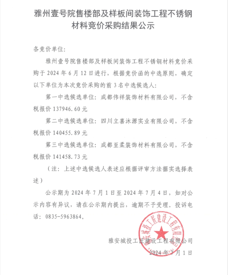 雅州壹號院售樓部及樣板間裝飾工程不銹鋼材料競價(jià)采購結(jié)果公示