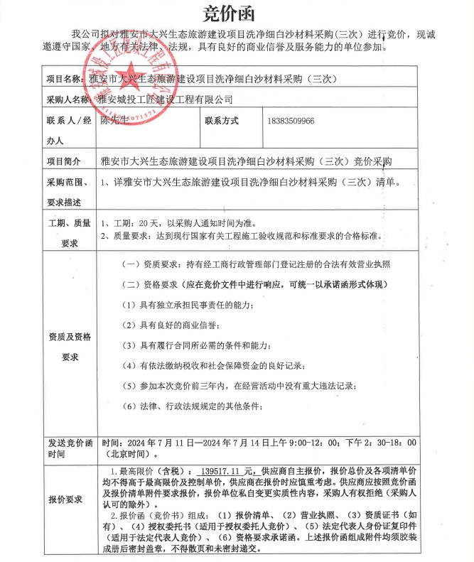 雅安市大興生態(tài)旅游建設(shè)項(xiàng)目洗凈細(xì)白沙材料采購(gòu)(三次)競(jìng)價(jià)公告