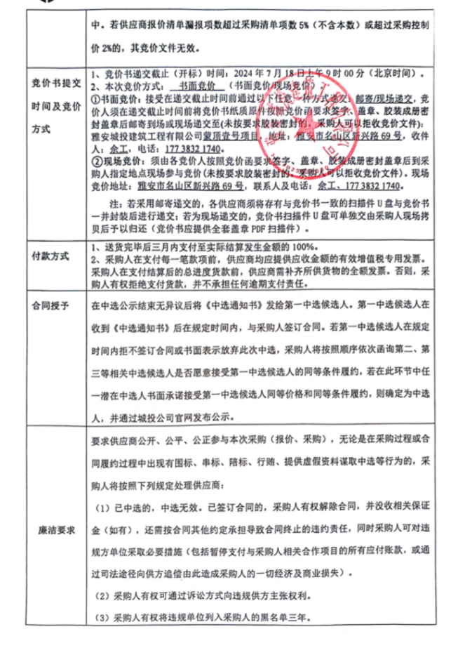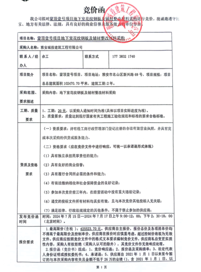 蒙頂壹號項(xiàng)目地下室花紋鋼板及輔材整改材料采購競價公告