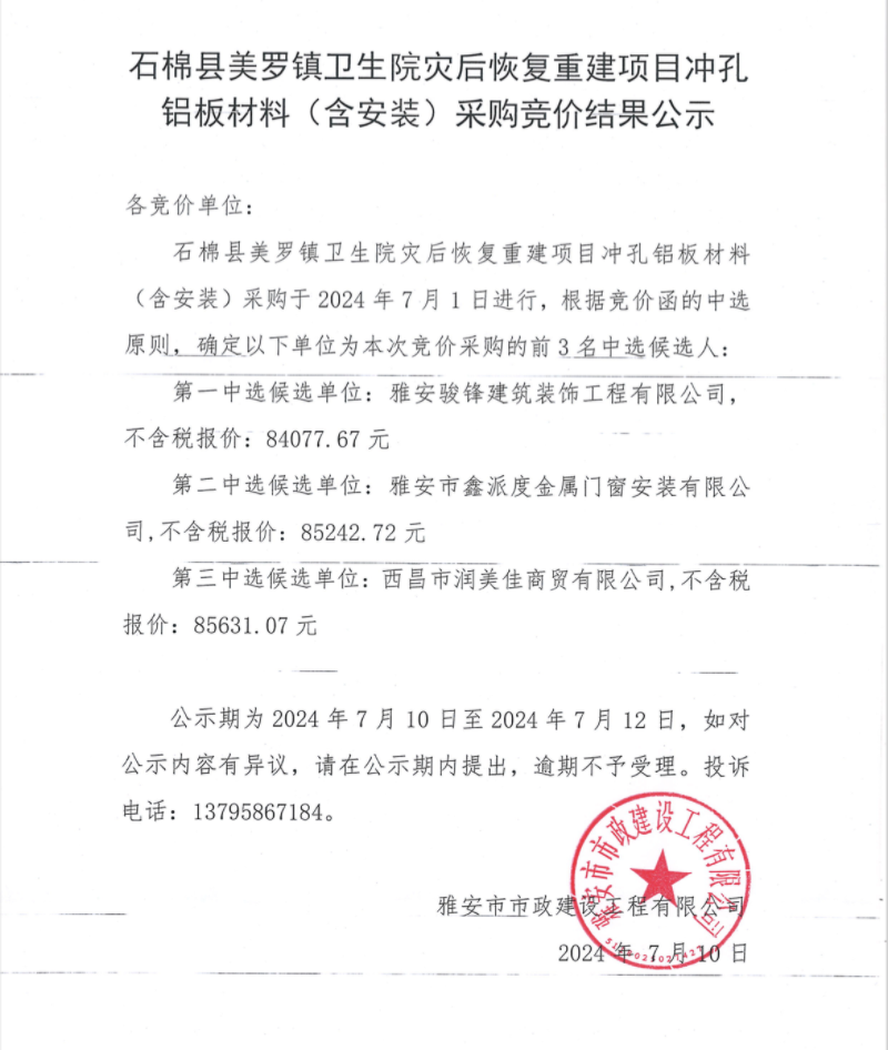 石棉美羅鎮(zhèn)衛(wèi)生院災(zāi)后恢復(fù)重建項(xiàng)目沖孔鋁板材料(含安裝)采購競價(jià)結(jié)果公示