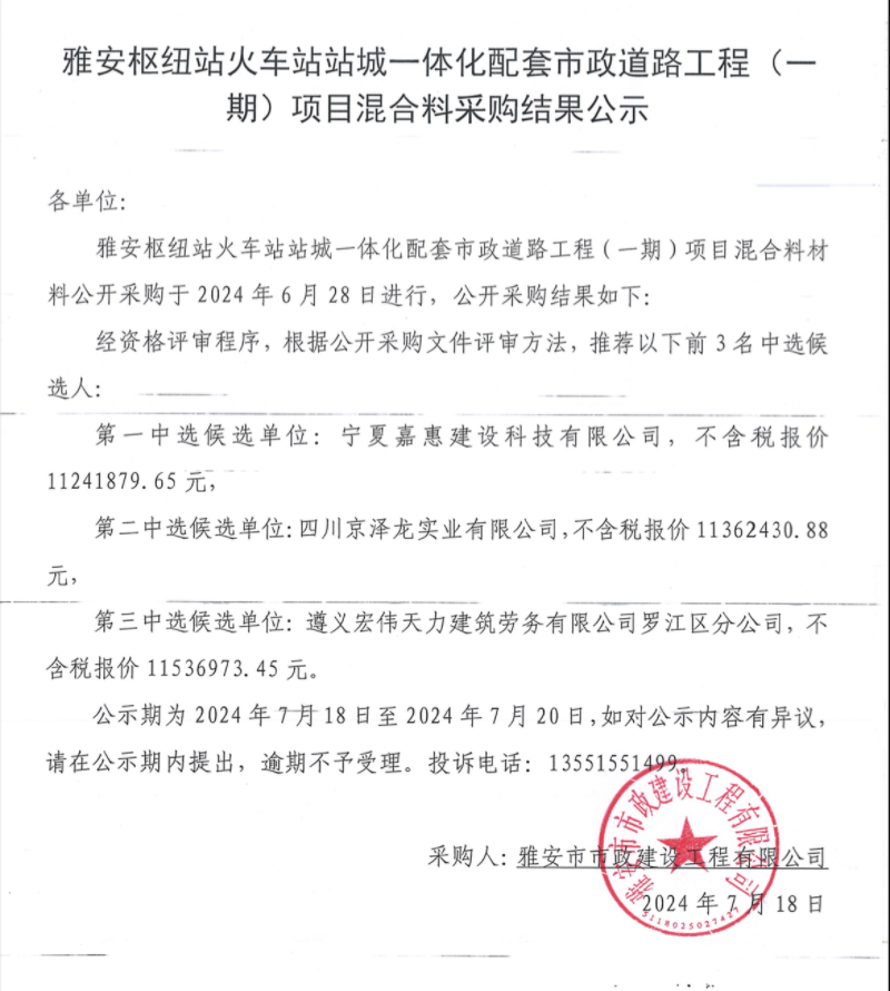 雅安樞紐站火車站站城一體化配套市政道路工程(一期)項(xiàng)目混合料采購結(jié)果公示