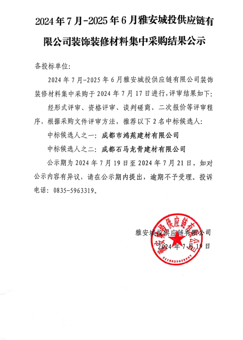 2024年7月-2025年6月雅安城投供應(yīng)鏈有限公司裝飾裝修材料集中采購結(jié)果公示