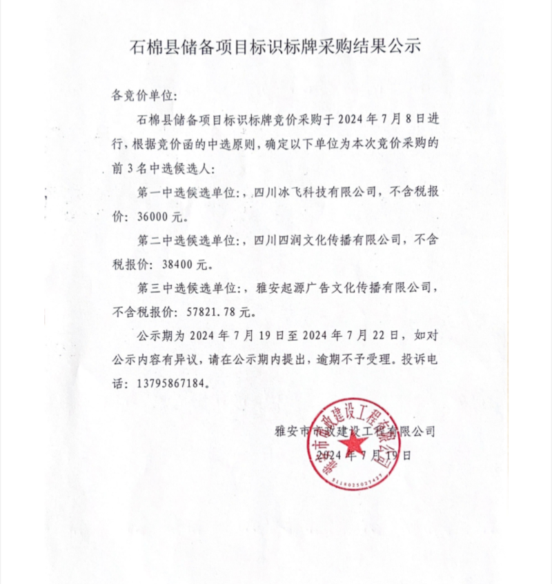 石棉縣儲備項(xiàng)目標(biāo)識標(biāo)牌采購結(jié)果公示