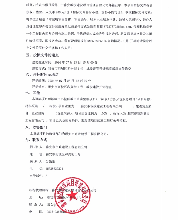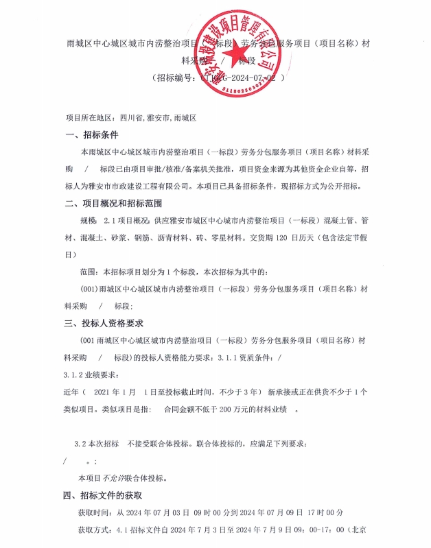 雅安市城區(qū)中心城市內澇整治項目(一標段)勞務分包服務項目(項目名稱)材料采購招標公告