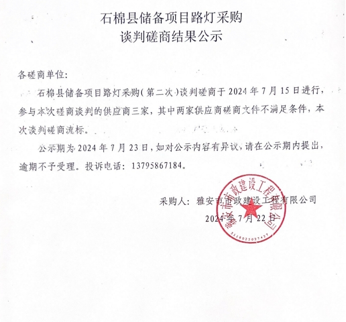 石棉縣儲備項(xiàng)目路燈采購談判磋商結(jié)果公示