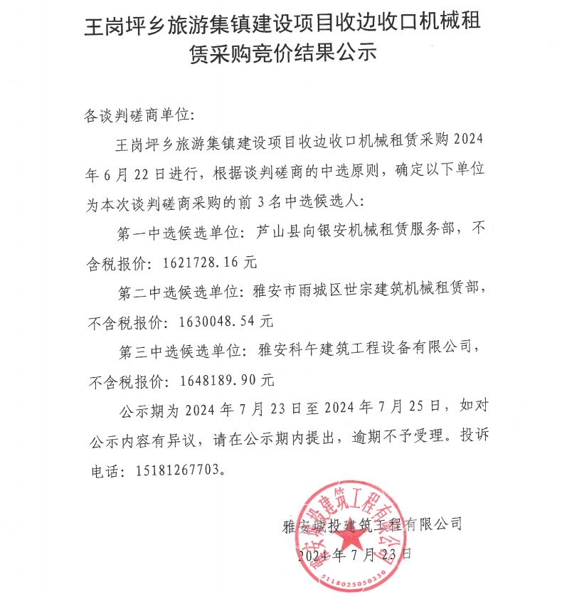 王崗坪鄉(xiāng)旅游集鎮(zhèn)建設(shè)項(xiàng)目收邊收口機(jī)械租賃采購(gòu)競(jìng)價(jià)結(jié)果公示