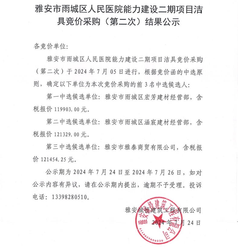 雅安市雨城區(qū)人民醫(yī)院能力建設(shè)二期項目潔具競價采購(第二次)結(jié)果公示