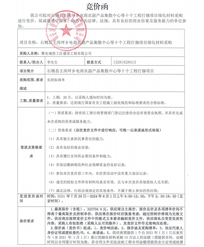 附件:石棉縣王崗坪鄉(xiāng)電商農(nóng)副產(chǎn)品集散中心等十個(gè)工程打捆項(xiàng)目綠化材料競(jìng)價(jià)函