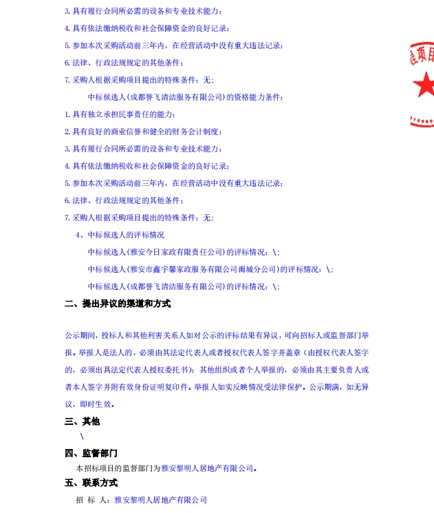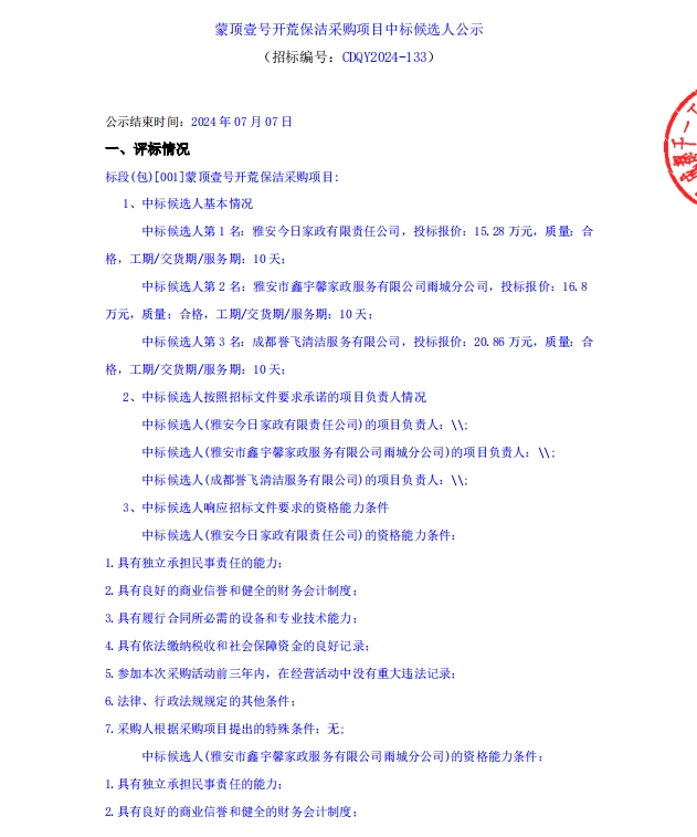 蒙頂壹號開荒保潔采購項目中標候選人公示