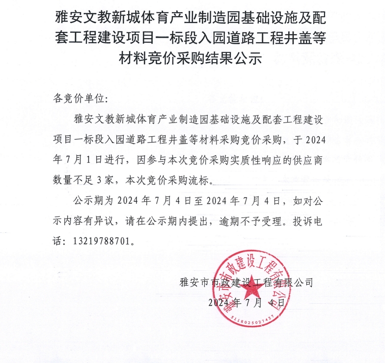 雅安文教新城體育產(chǎn)業(yè)制造園基礎(chǔ)設(shè)施及配套工程建設(shè)項目一標(biāo)段入園道路工程井蓋等材料競價采購結(jié)果公示