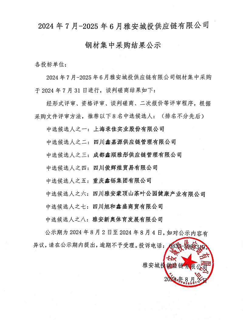 2024年7月-2025年6月雅安城投供應(yīng)鏈有限公司鋼材集中采購(gòu)結(jié)果公示
