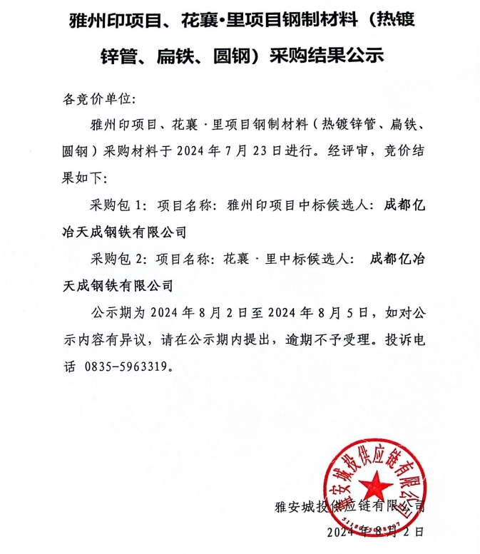 雅州印項(xiàng)目、花襄·里項(xiàng)目鋼制材料(熱鍍鋅管、扁鐵、園鋼)采購結(jié)果公示