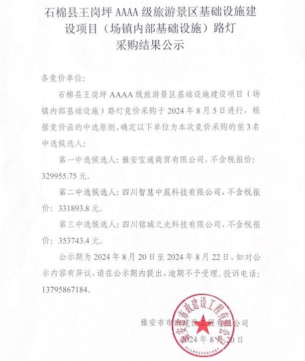 石棉縣王崗坪鄉(xiāng)AAAA級(jí)旅游景區(qū)基礎(chǔ)設(shè)施建設(shè)項(xiàng)目(場(chǎng)鎮(zhèn)內(nèi)部基礎(chǔ)設(shè)施)路燈采購(gòu)結(jié)果公示