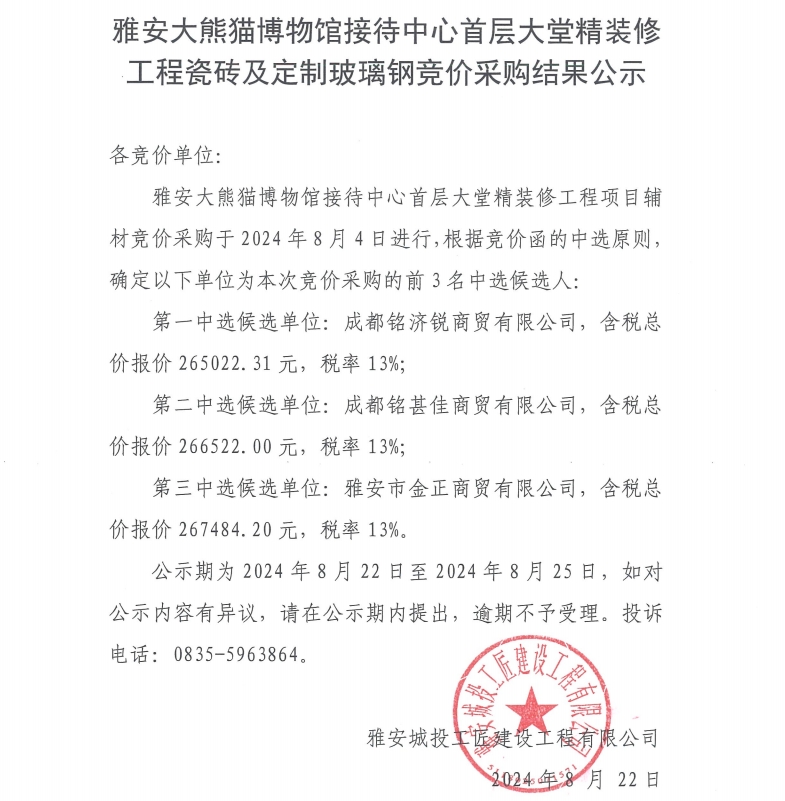 雅安大熊貓博物館接待中心首層大堂精裝修工程瓷磚及定制玻璃鋼競價采購結(jié)果公示