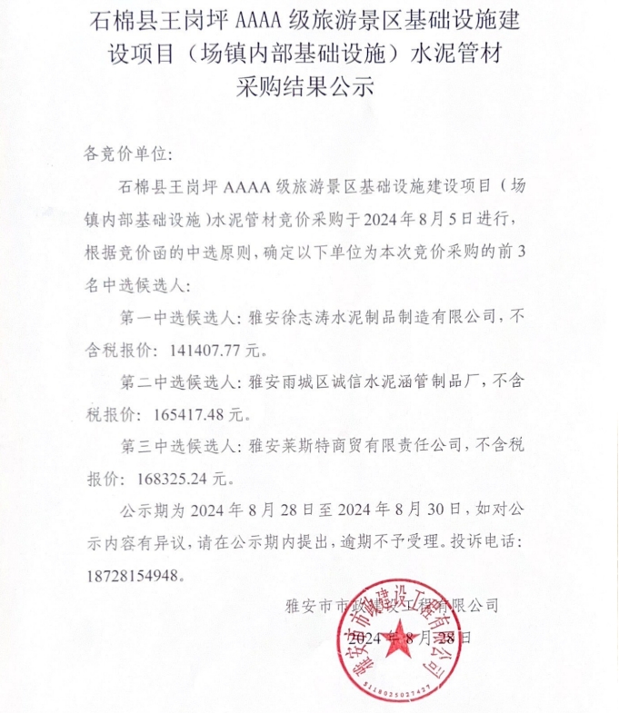 石棉縣王崗坪AAAA級旅游景區(qū)基礎(chǔ)設(shè)施建設(shè)項(xiàng)目(場鎮(zhèn)內(nèi)部基礎(chǔ)設(shè)施)水泥管材采購結(jié)果公示