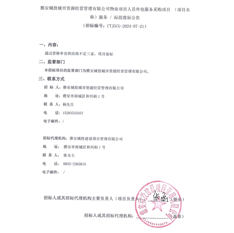 雅安城投城市資源經(jīng)營管理有限公司物業(yè)項(xiàng)目人員外包服務(wù)采購項(xiàng)目(項(xiàng)目名稱)服務(wù)/標(biāo)段廢標(biāo)公告
