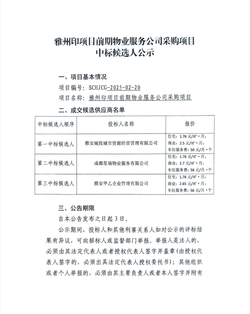 雅州印項(xiàng)目前期物業(yè)服務(wù)公司采購項(xiàng)目中標(biāo)候選人公示