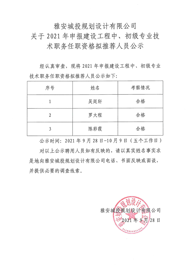 雅安城投規(guī)劃設(shè)計(jì)有限公司關(guān)于2021年申報(bào)建設(shè)工程中、初級專業(yè)技術(shù)職務(wù)任職資格擬推薦人員公示