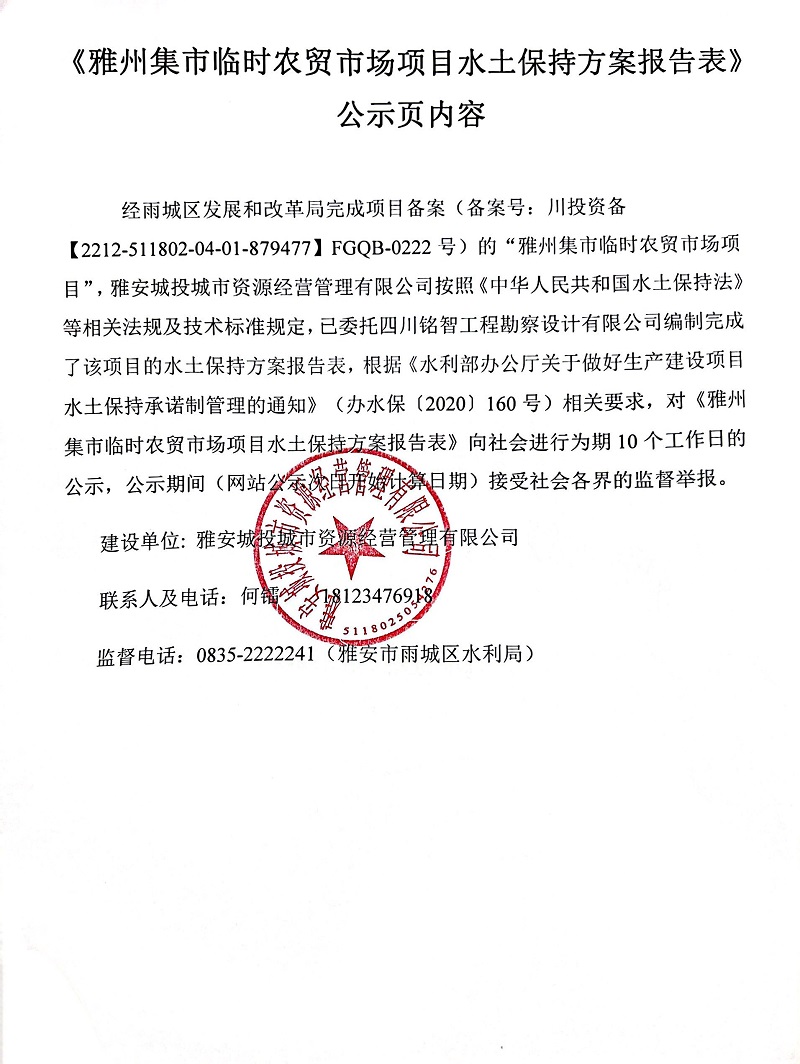 《雅州集市臨時(shí)農(nóng)貿(mào)市場(chǎng)項(xiàng)目水土保持方案報(bào)告表》公示