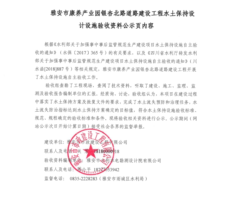 雅安市康養(yǎng)產(chǎn)業(yè)園銀杏北路道路建設(shè)工程水土保持設(shè)計設(shè)施驗收資料公示頁內(nèi)容