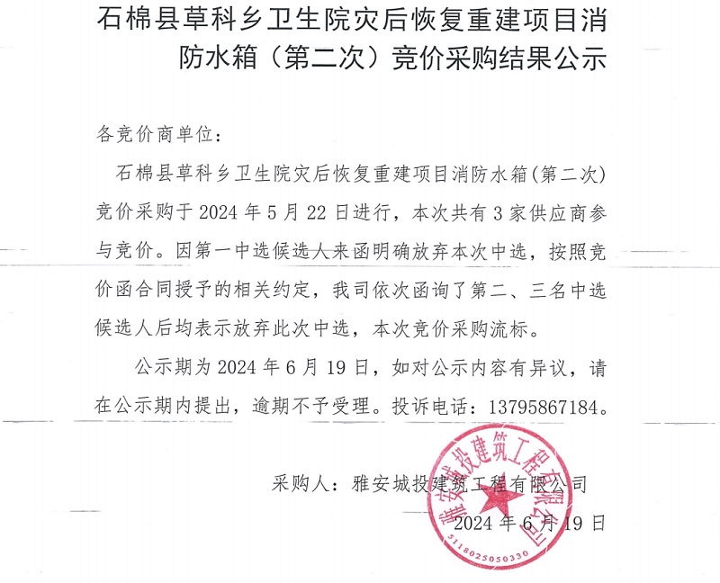 石棉縣草科鄉(xiāng)衛(wèi)生院災(zāi)后恢復(fù)重建項目消防水箱(第二次)競價采購結(jié)果公示
